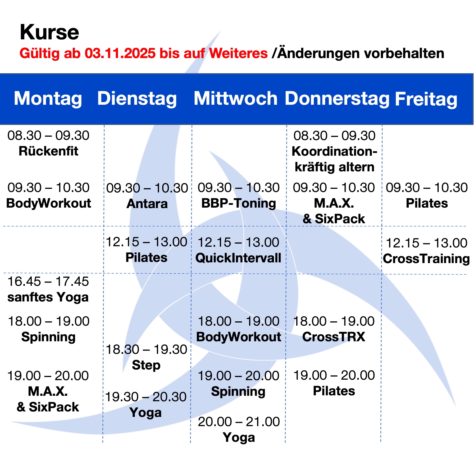 Nur saubere Sportschuhe und Indoor-Spinningschuhe sind erlaubt! Gedämpfte Schuhe empfehlenswert. Zu spätes Erscheinen schadet deinem Körper, zu frühes Verlassen des Kurses stört die Teilnehmer. Einsteiger bitten wir, 15 min. vor Kursbeginn anwesend zu sein.